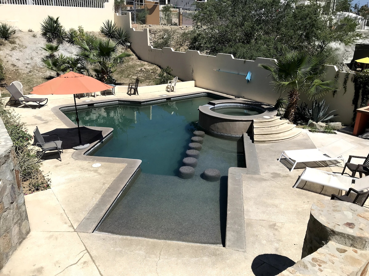 This beautiful home is located on a golf course with ocean and mountain views. This 3000+ sq. ft, home is 2 or 3 blocks to the beach, shopping and resturants. Remodeled in 2015, home sleeps 6 comfortably. It's 20 minutes to SJD airport. Back yard is a private oasis with pool. Chef's kitchen has everything you will need, including a dishwasher and gas range. Bedrooms have excellent separation of space and each has a private bath. Gardens are well maintained.