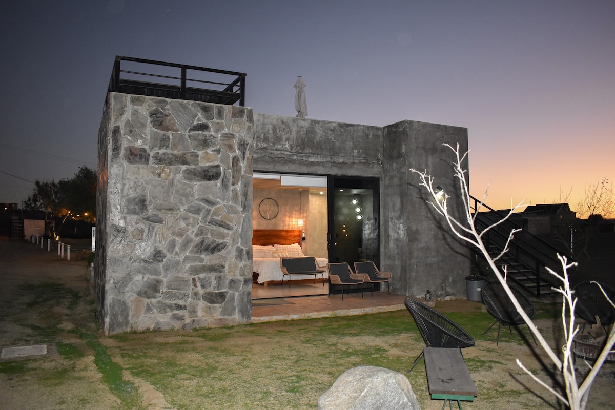 Habitación diseñada para un descanso placentero y disfrutar de amaneceres, atardeceres, el cielo, estrellas y la luna desde su terraza. Para dos personas, con cama Queen, aire acondicionado, ventilador, cafetera, agua caliente e internet satelital de alta velocidad. Barda perimetral para privacidad y seguridad. El baño tiene espejo, jabón, shampoo, acondicionador, toalla de mano y secadora de pelo. Disfruta viñedos y vinícolas en Valle . Seguro y cerca de lugares emblemáticos de la región.