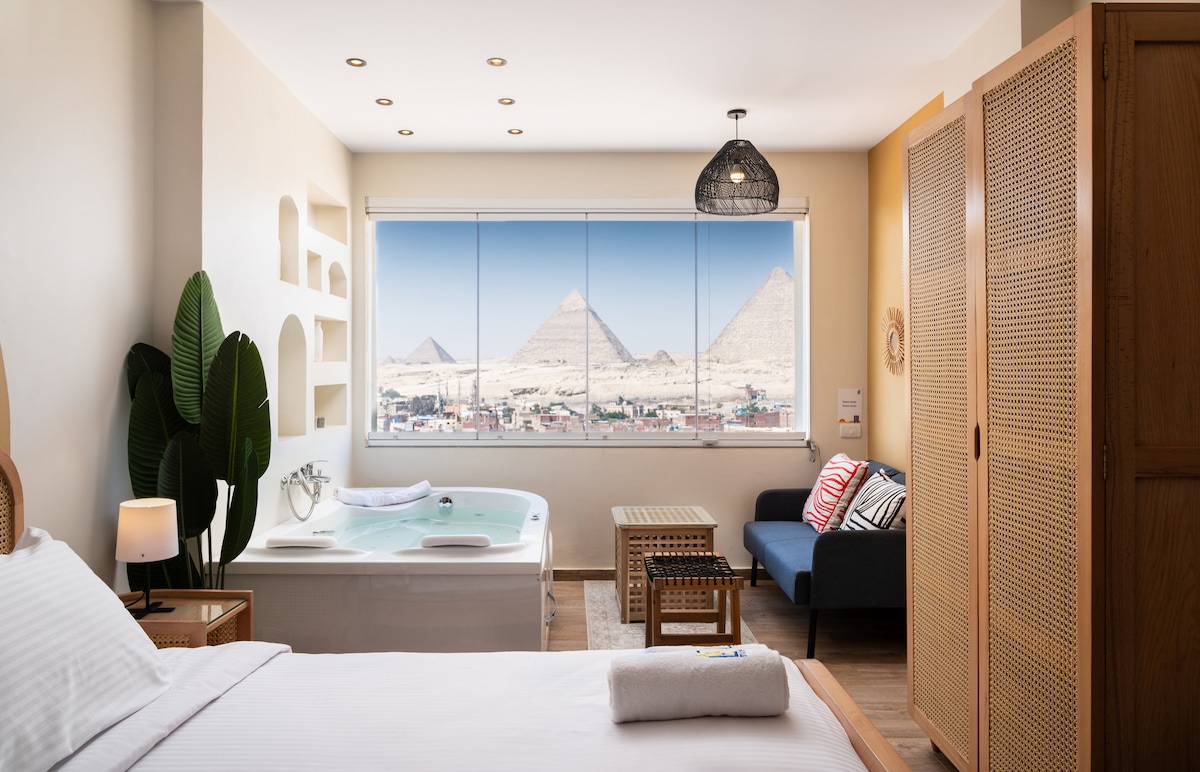 Gran jacuzzi en suite con vistas a las pirámides y desayuno gratis