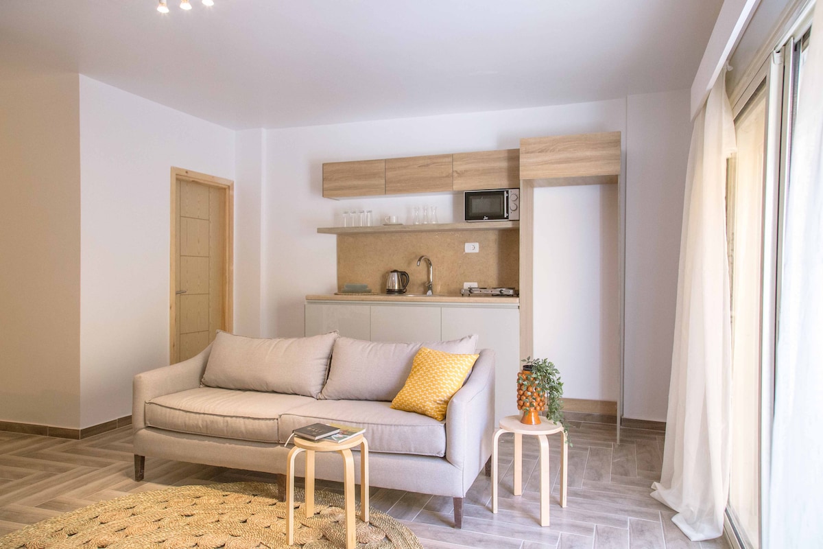 Descubre tu refugio cerca de las pirámides, un espacio donde las maravillas antiguas se mezclan a la perfección con el estilo moderno. Contempla la majestuosa vista desde tu habitación y sumérgete en la magia de Guiza con total comodidad. Este estudio iluminado por el sol y cuidadosamente diseñado es tu puerta de entrada para explorar el destino más emblemático de Egipto.
