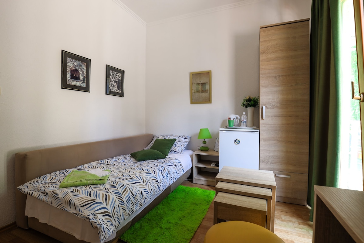 ROOM ELLA : The small room, bathroom, terrace and garden are private just for you. There is no kitchen. ROOM : Double bed 190 x 140 , airconditioner, fridge, Wi-fi for free, TV, private bathroom. The old town is a 12-15 minute walk away. SUPERMARKET is only 50 m far, bus station 100 m.