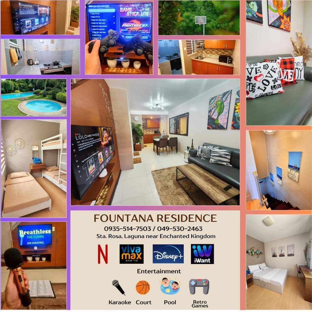 ¡Disfruta de una estancia relajante y haz que tu próxima visita a EK sea inolvidable! A 5 minutos de ENCHANTED KINGDOM Ciudad de San José Sta. Rosa A 10 minutos de Sta. Hospital Médico Rosa y Waltermart A 15-20 minutos de Nuvali, Paseo Outlets Cerca de la autopista South Luzon WIFI Netflix Aire acondicionado centralizado Comodidades básicas de la cocina 2 baños con 1 calentador. Seguridad las 24 horas, 7 días a la semana. Estacionamiento gratuito: garaje y calle El total de 4 dormitorios tiene capacidad para 10 personas ( podemos organizarlo si tienes más de 10 años)