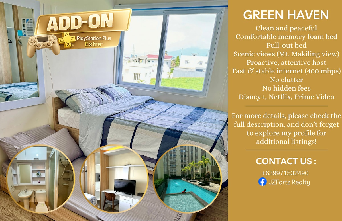 Relájate en Casa Ivy, un acogedor estudio de estilo japonés diseñado para estancias sencillas y cómodas. Limpio y cuidadosamente amueblado con una cama doble, sofá cama, wifi rápido, Netflix y una relajante vista a la ciudad. Ubicado en Greenfield City, cerca de Paseo, Nuvali y Landers. Ideal para huéspedes solos, parejas o estancias de trabajo desde casa. ✨ El edificio admite mascotas, pero debido a problemas de salud, nuestra unidad no puede alojar mascotas. No se permite fumar dentro de la unidad.