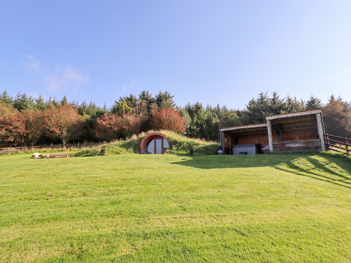 This turf covered cabin is a blend of Viking longhouse and underground hobbit hideaway. It's in a beautiful spot in our orchard between the mountains and the sea on our small permaculture farm. Experience camping fire cooking, and clear starlit skies, whilst having a comfy bed, a kitchen, hot water, shower compost toilet and a wood burning stove to cosy round if it gets cold. All on our sustainable ecological farm which has lakes, woodlands and animals to find and explore.