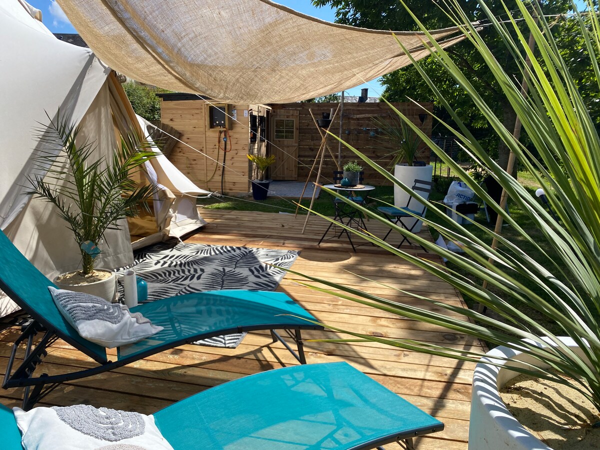 Vous dormirez dans une tente en coton sur une terrasse pilotis. Plus de 1 hectare au cœur de la nature rien que pour vous ! Je propose un hébergement insolite sous le thème du bien-être, du vivre simplement et de l'écologie. Si vous êtes des amoureux de la nature, vous êtes au bon endroit ! *Lire tout le descriptif et me signaler lors de la réservation vos options. -Massage bien-être à partir de 25€ -Différentes options pour un séjour personnalisé selon vos envies et votre budget !