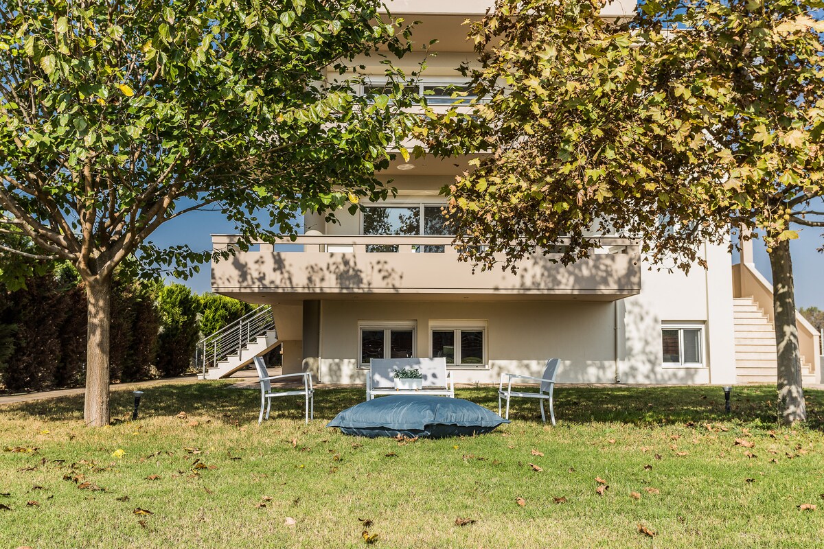 Our unique apartment is located on the second floor of a dreamy house in Epanomi. It is a 3' car ride from the beach, in a quiet neighborhood. You will enjoy the view of Olympus mountain, the sea and the sunset! A super comfy bed, a cozy sofa bed for two, a beautifully designed space with a jacuzzi, a huge balcony, an amazing garden and barbecue, safe parking, are some of the amenities. Epanomi is very closed to Thessaliniki and Makedonia airport!
