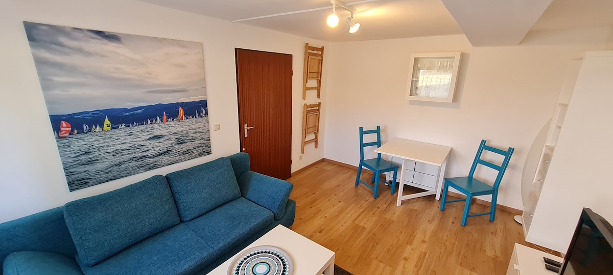 Modernes, kleines 1-Zimmer-Apartment ca.27 qm, mit Bad und Terrasse, zum Wohlfühlen. Das Apartment befindet sich im EG, angrenzend unseres Wohnhauses. Der Bodensee ist in ca. 15 Min. fußläufig erreichbar. Einkaufsmöglichkeiten, Cafés und Restaurant liegen in nächster Nähe. Zu Fuß: Schiffsanlegestelle: 15 Min Bahnhof: 8 Min Bäckerei, Supermarkt: 5 Min Naturbadestrand Malerecke, der zum Baden einlädt: 15 Min Messe/Flughafen Friedrichshafen 10 Min. Autofahrt Fahrradverleih vor Ort möglich