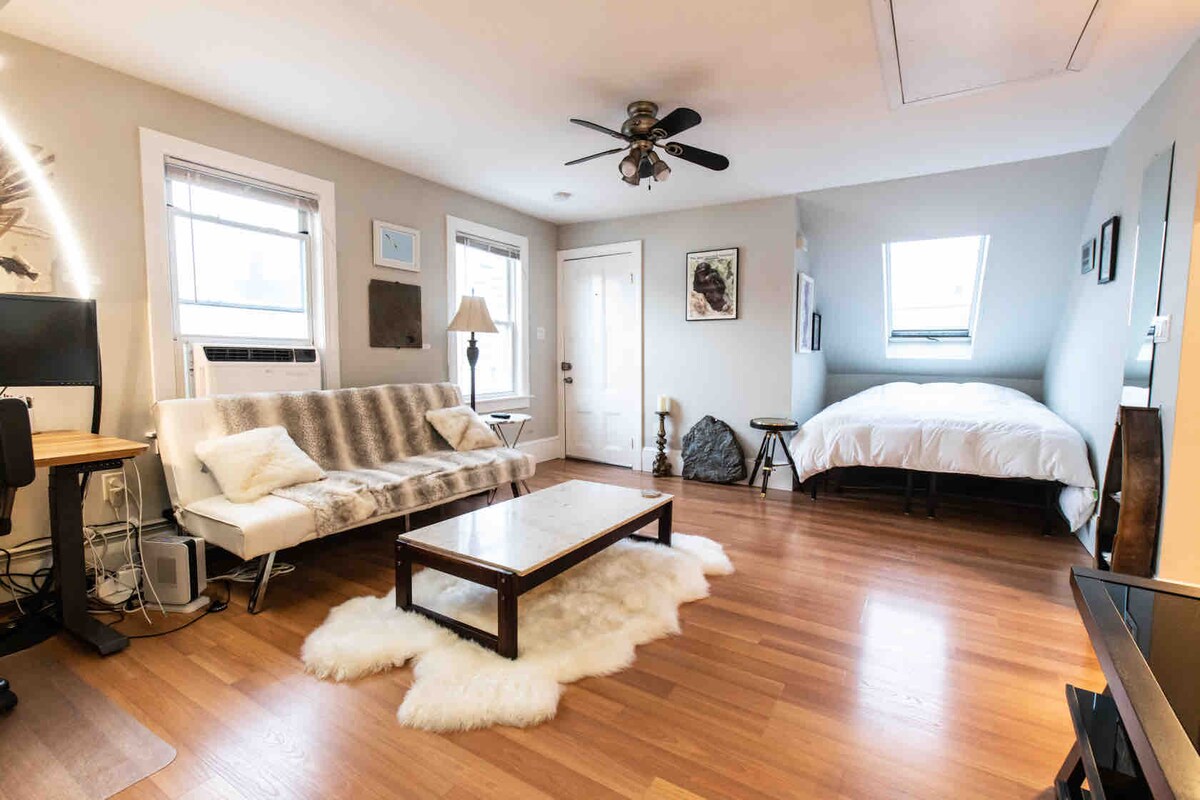 ¡Disfruta de las vistas panorámicas del amanecer/atardecer desde el nuevo santuario del ático del sexto piso, el punto más alto de Peabody! Este espacioso ático de planta abierta cuidadosamente decorado es un lugar para retirarse, recargar energías, escribir, imaginar y disfrutar de lo mejor de la vida. A poca distancia a pie del centro comercial NS Mall/Borders Books, donde llega el Logan Express. También a una milla de distancia se encuentran los senderos para correr, los hermosos estanques y la recolección de manzanas en la granja Brooksby y a seis millas de distancia de la histórica Salem. ¡Te encantará!