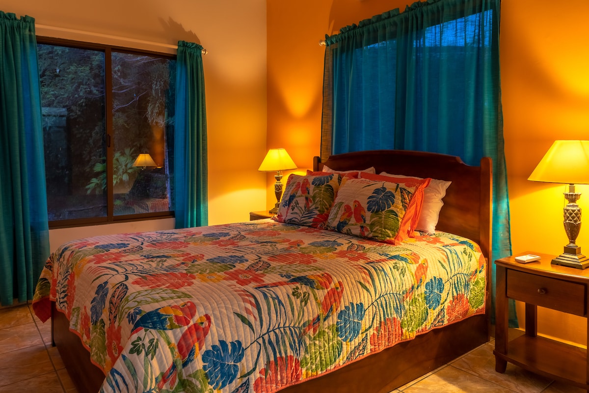 Suite moderna rodeada de naturaleza, a 2 min de Playa Hermosa (cerca de Jacó), famosa por el surf! Cómodo espacio con 2 habitaciones (con A/C), 1 baño, y cocina/comedor techado al aire libre. Relájate en la terraza con vista al jardín y observa a los monos cariblanca, lapas y tucanes que nos visitan a diario. El alojamiento privado está en planta baja, con entrada independiente, pero es parte de nuestra casa donde vivimos los anfitriones. Jardín y parqueo cerrado se comparte con nosotros.