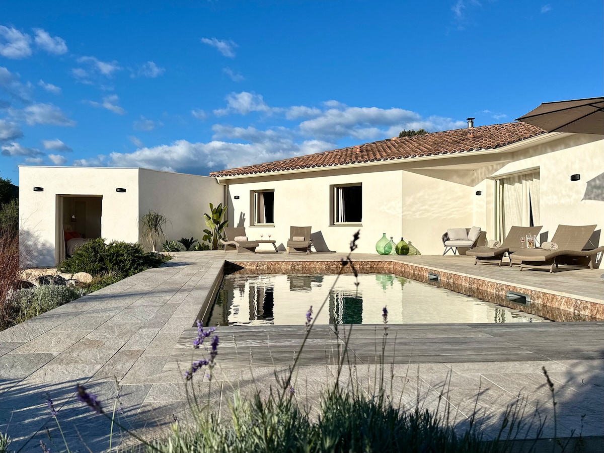 Lujo y ocio a 3 minutos A PIE de la sublime playa de Santa Giulia (a 7 km de Porto-Vecchio) y a 25 minutos del aeropuerto de Figari. ¡Lujo de una suite de hotel, bienvenida de una casa de huéspedes y autonomía de un amueblado! Casa de lujo en residencia privada en el parque arbolado. Clim, Wifi, terraza, jardín, barbacoa, estacionamiento privado… 4 camas: cama doble 160 + ALTILLO con dos camas individuales (90x2). Ropa de cama y baño INCLUIDO. ⚠️LIMPIEZA 80 € A PAGAR EN EL LUGAR. Paddle gratis*. 🚙 Coche en alquiler. Salidas en zodiac.