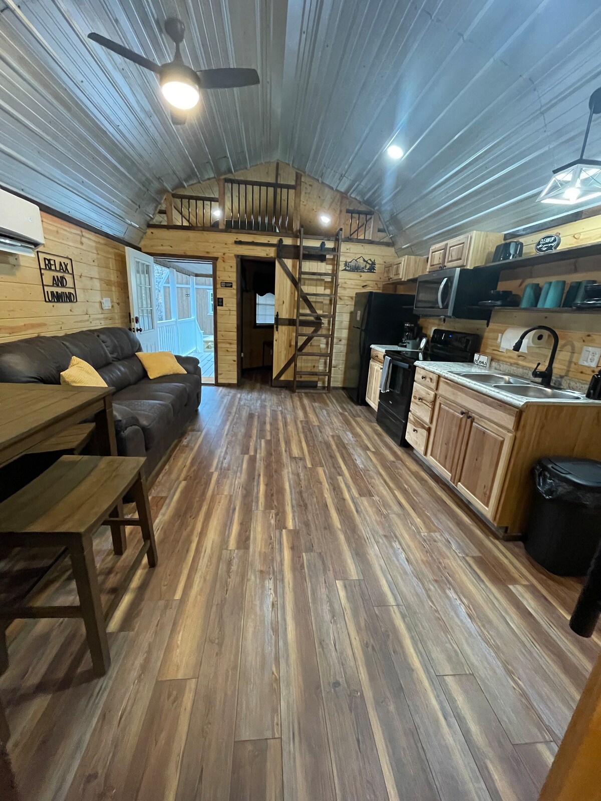 Private parking with a 30ft walking bridge overlooking a water stream to lead you to the cottage. Queen bedroom downstairs; spiral staircase takes you to your loft queen bedroom; one full bath; full kitchen; TV/WIFI; indoor loft hammock; wrap around covered porch; tree covered outdoor shower area with hot tub; covered dining back porch. Large fire pit area with dried fire wood. Large 12ft x 12ft outdoor hammock beside fire pit. Park Series charcoal grill outside.