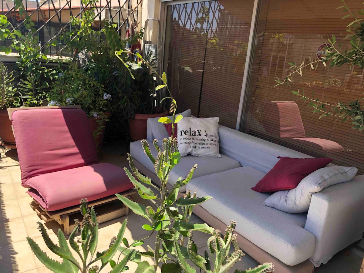 A solo 250 metros de la estación de metro de Metaxourgio, este ático es un verdadero hogar acogedor, no un alquiler turístico típico y se permite fumar. Tiene un dormitorio soleado, una cómoda sala de estar con pared de cristal con vistas a Atenas, cocina totalmente equipada, wifi gratuito, TV de plasma, terraza soleada, lavadora y secadora, plancha, aire acondicionado, supermercados, cafeterías, bares, farmacia y tabernas. Como a veces vivo allí, puedes encontrar todo lo que necesitas, desde aspirinas hasta pasta de dientes y zapatillas.