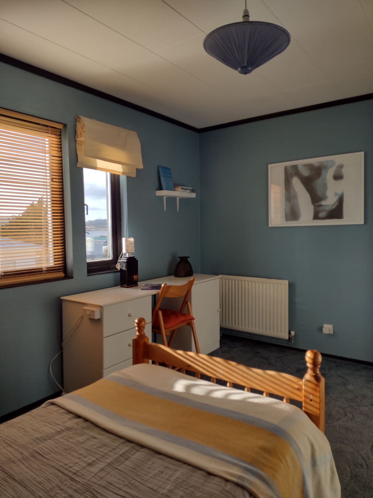 Single but spacious, sun-facing room in working artist's home. Cosy and stylish, lots of storage space with built-in wardrobes and soft carpets. The house is a large, Scandinavian design chalet fifteen minutes walk to the centre of Stanley. My home has two air b and b rooms - this one on the north side, and a room with a double bed on the south side. There are 2 bathrooms, which are shared, large modern kitchen to use freely, plus a sun porch, dining area and outside seating/barbecue area.