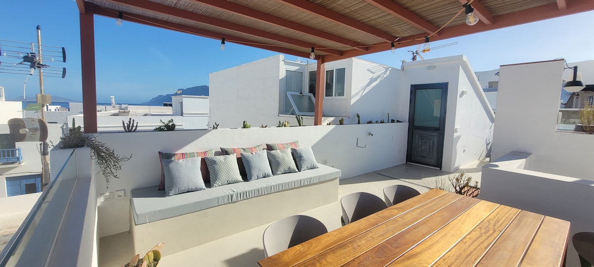 Bonito dúplex de nueva construcción de 110 metros cuadrados, muy amplio y luminoso, ubicado en una de las zonas más tranquilas de Caleta de Famara, entre las playas de San Juan y de Famara y a 50 metros de la línea del mar. Cuenta con dos habitaciones, salón con cocina totalmente equipada, cuarto de TV con sofá cama, dos cuartos de baño y un patio muy acogedor, así como un cuarto de lavadora.
