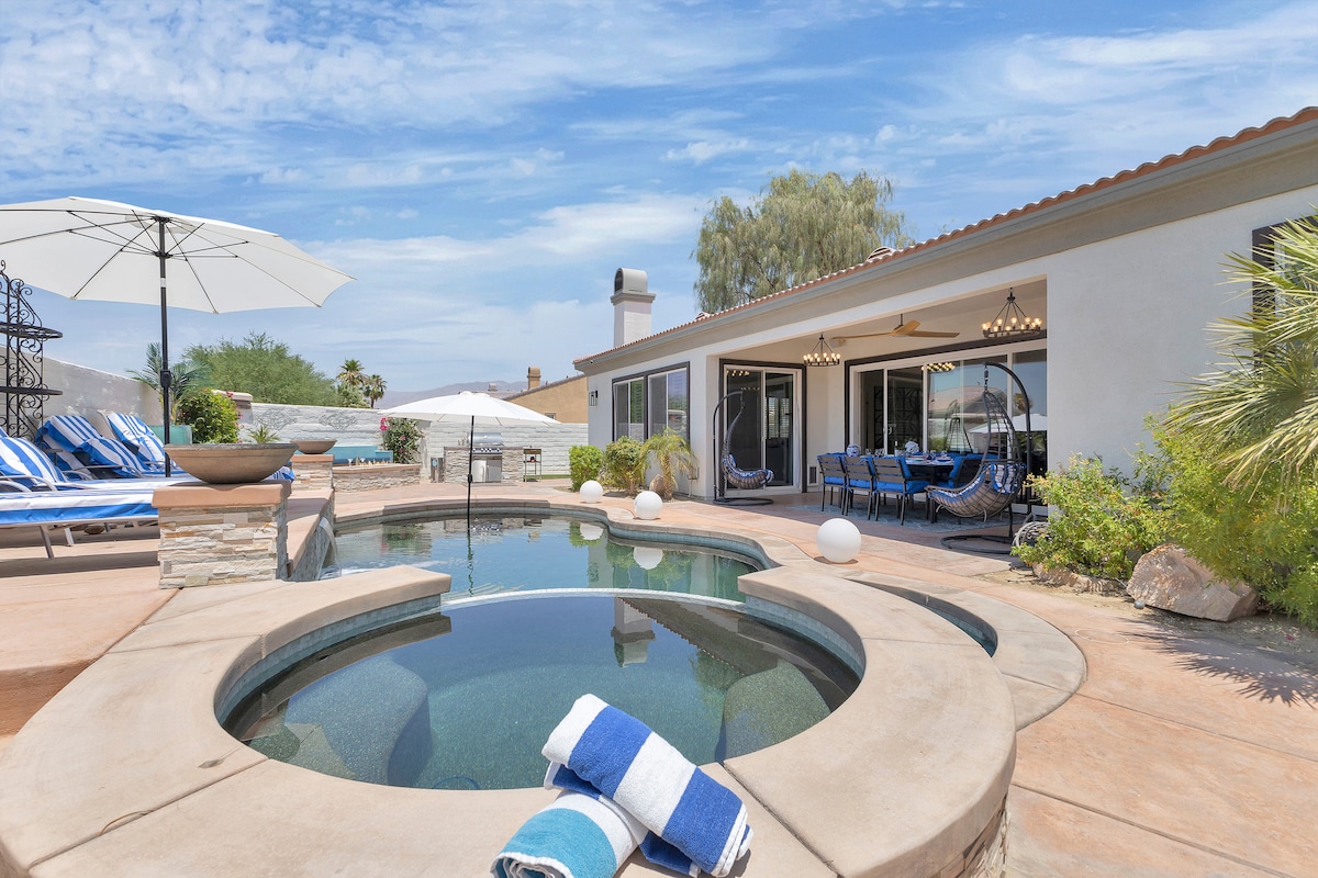 ¡Resort La Quinta con piscina privada, jacuzzi y chimenea! Esta hermosa casa de 3 dormitorios y 3 baños está amueblada con todos los muebles y televisores de alta gama y cuenta con todas las comodidades para una estancia corta o larga. Perfecto para una escapada de fin de semana, fines de semana de festivales o para disfrutar del hermoso clima del desierto. El plano de planta abierta y amplio es muy acogedor y ofrece mucho espacio para grupos grandes o familias. Ubicado a pocos minutos de Coachella, el casco antiguo de La Quinta, PGA West y mucho más.