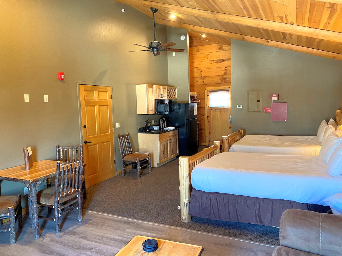 Lo que a los huéspedes les encanta de estas unidades es tener una unidad grande de dos baños de 768 SF en dos plantas con una cocina americana, una sala de estar con su propio televisor de pantalla plana sobre la acogedora chimenea. Ten en cuenta que es posible que escuche a tus vecinos de al lado cuando estés en una cabaña dúplex. El loft de esta cabaña cuenta con una cama de matrimonio, una litera y un baño completo. También cuenta con sofá cama.