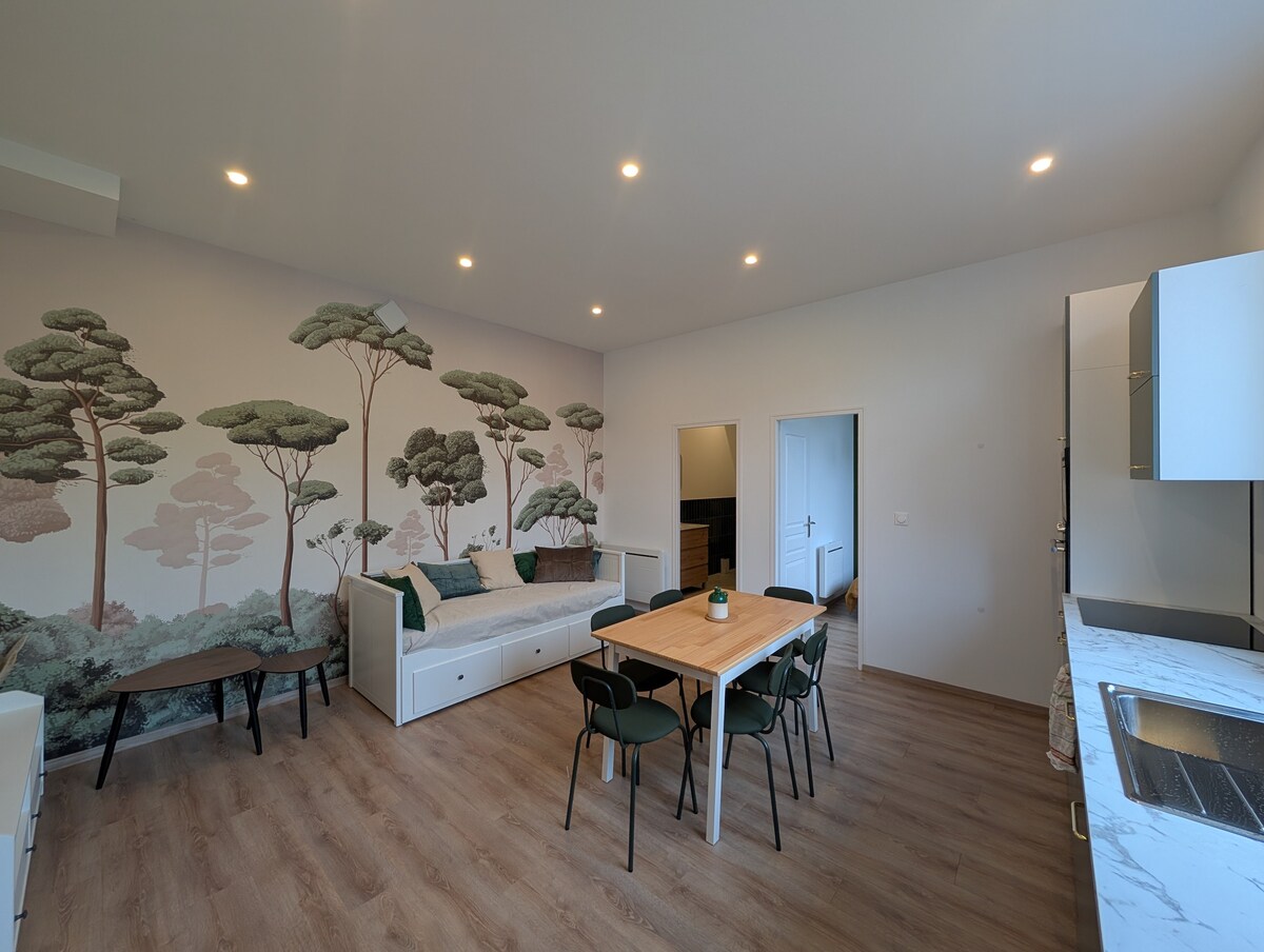 Disfrute de un estudio tranquilo con un bonito patio privado, idealmente situado cerca de la estación de tren y el centro. Le gustará la ropa de cama de hotel de alta calidad, la televisión conectada, el wifi de fibra y la cocina equipada. Llegada autónoma. Perfecto para una estadía cómoda, profesional o relajante en Saint-Quentin.