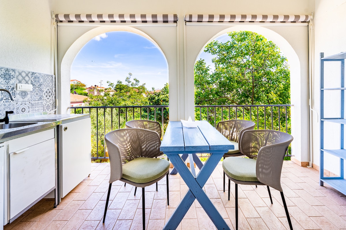 Studio holiday home lijepi Omitej with a view of the sea, Brijuna Islands, is located in a quiet location surrounded by Mediterranean plants and olive groves. The house is located 1.5 km from the beach and all facilities in the heart of Fažana. Right next to the house there is a bicycle path that can be used to get to the center of Fažana through nature