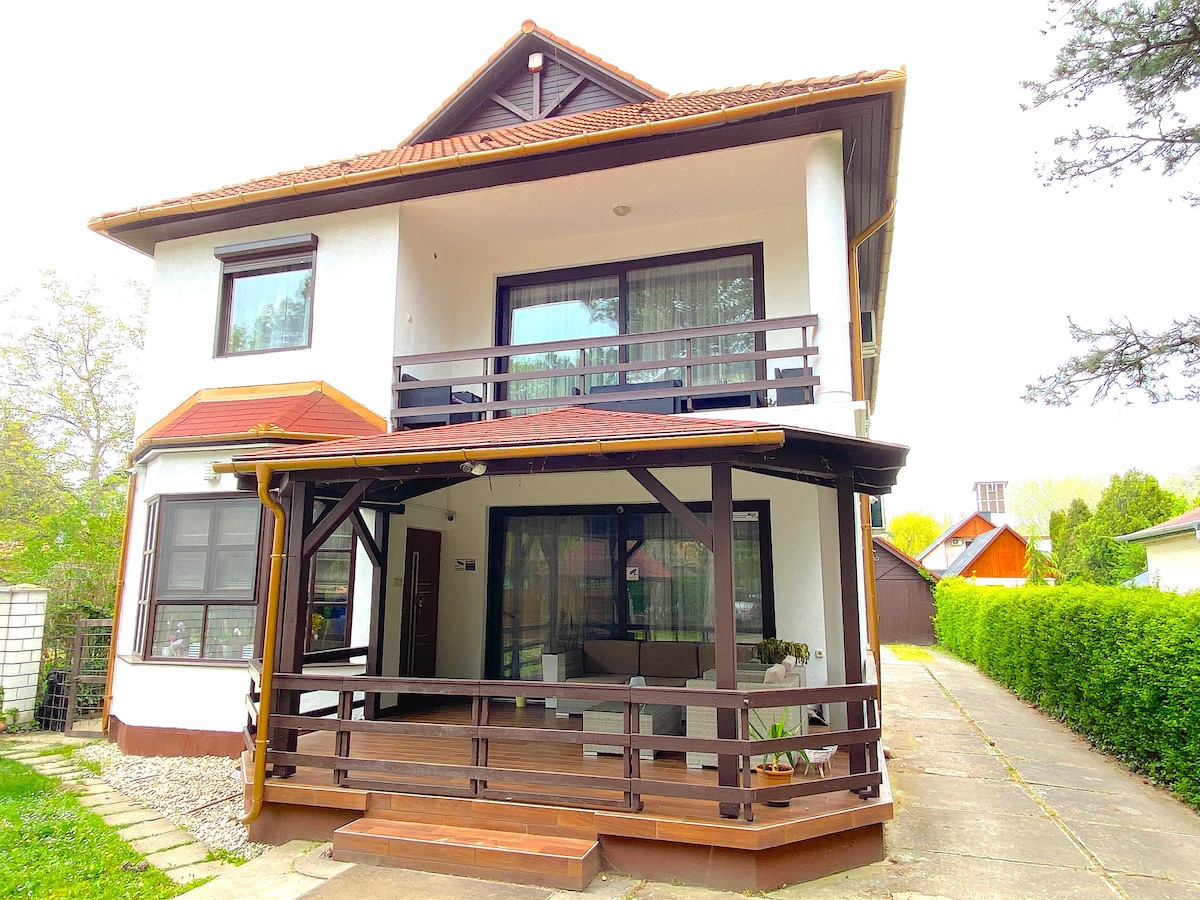 Come and relax in our peaceful and newly remodeled guesthouse. One bedroom with double bed, one bathroom and a small room with a tiny kitchen (full) and a pullout sofa. Washer and drier in the bathroom. Main room has air conditioning. Assigned parking plus additional free street parking. Centrally located, walking distance to shops, restaurants and cafes as well as nature hikes. Bus stop is a 2 min walk, with buses going straight to Budapest. Budapest is about a 10 min ride/drive.