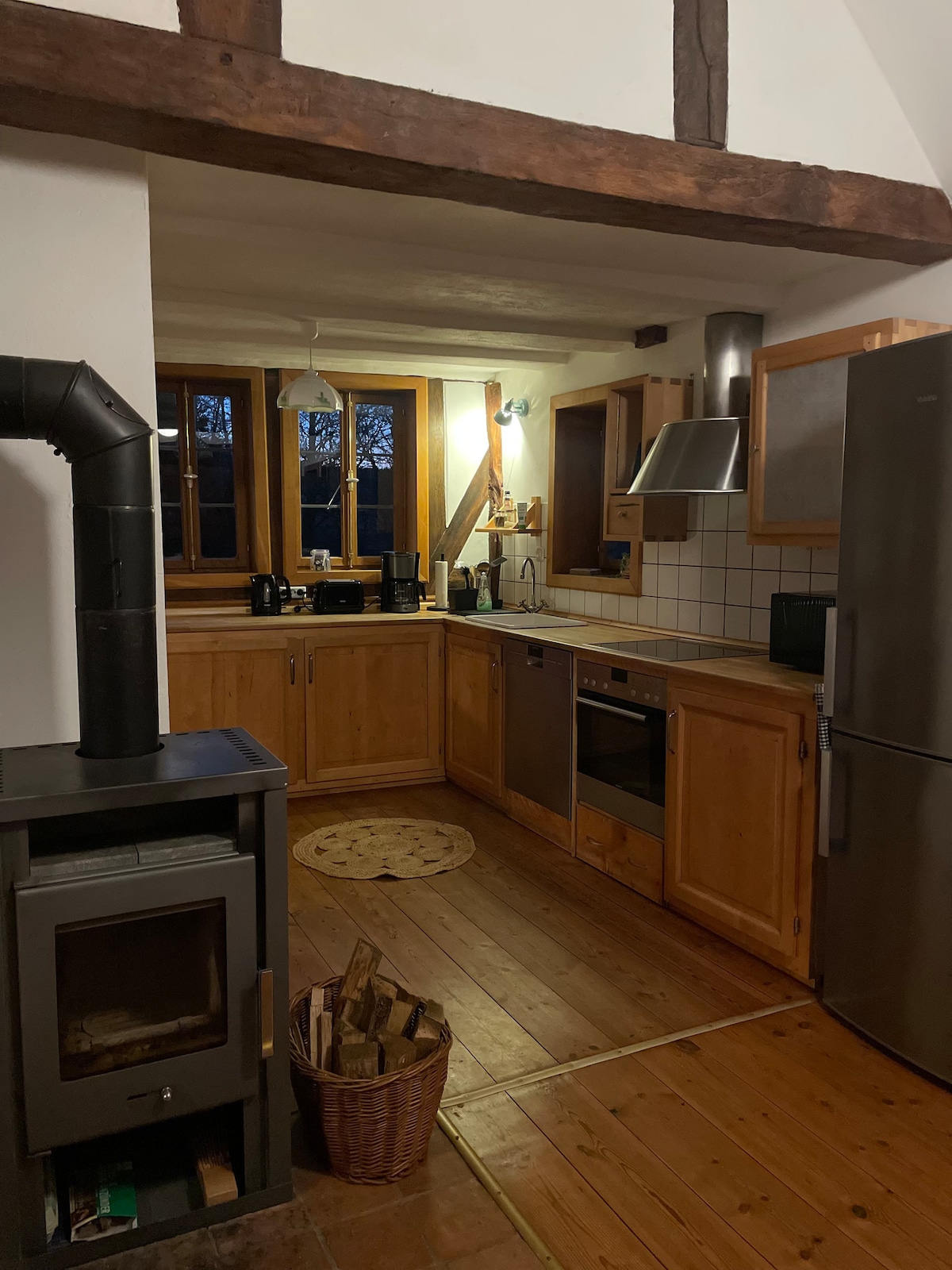 Vivimos en el campo con mucha vegetación y aire fresco y espíritu libre y estamos abiertos a los huéspedes. La casa de hornear, con muebles tradicionales, estufa de leña, loft para dormir y comodidad completamente atemporal, se encuentra por separado en la propiedad. Junto al edificio residencial (a 40 m) se encuentra la moderna casa de baños para uso exclusivo de nuestros huéspedes. En nuestra casa, leemos mucho, filosofamos, bebemos buen vino y cuidamos lo esencial en la vida, ¡puramente minimalista! Aventura en lugar de lujo.