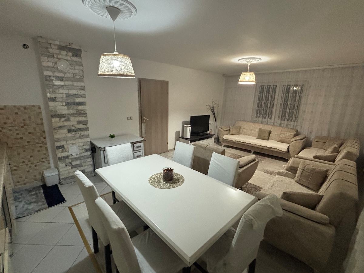 El apartamento tiene capacidad para 5-7 personas y 120 metros cuadrados. El apartamento tiene dos dormitorios grandes y uno más pequeño. Hay una gran sala de estar, una cocina y un baño. Hay dos balcones; uno tiene una vista perfecta sobre Prishtina. El apartamento cuenta con Internet las 24 horas, agua y electricidad, aire acondicionado, sistema de calefacción central y cámaras de vigilancia al aire libre para tu seguridad. El barrio de Aktash es muy tranquilo y encantador, a solo 6-7 minutos del centro de la ciudad. La sede de Kosovo y GIZ está a 2 minutos del apartamento. Hay muchas tiendas de comestibles cerca y restaurantes muy agradables y pequeños bares en el barrio. El apartamento está totalmente equipado con muebles, cuenta con lavavajillas, lavadora y la cocina cuenta con todos los electrodomésticos y accesorios de cocina. El apartamento es para no fumadores, pero tiene dos balcones para el aire fresco y los fumadores. Proporciono: - Ropa de cama - Toallas - Todo el equipo de cocina necesario - Cafetera, incluido un poco de café para tu estancia - Alimentos básicos: aceite de oliva, vinagre, sal y pimienta, azúcar, té - Lavavajillas - Lavadora - WIFI - TV por cable Tenemos un jardín que puedes usar a tu gusto cuando quieras.