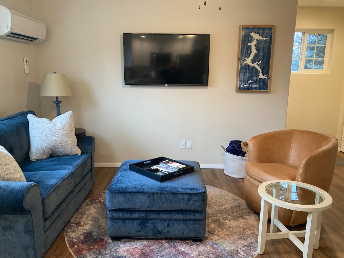 Descubre el mejor retiro del norte de Idaho a pocos minutos del lago Fernan en el lago Coeur D'Alene. Sumérgete en una suite principal amueblada moderna de mediados de siglo cuidadosamente diseñada, donde las anestésicas minimalistas se encuentran con la belleza natural. Un acogedor cama tamaño queen, muebles de inspiración vintage y un espacio de trabajo dedicado armonizan con el entorno sereno. No estamos frente al lago, pero estamos a 5 minutos a pie del muelle en Fernan Lake. ¿Necesitas otro incentivo para reservar? ¡No hay ninguna tarifa de limpieza!