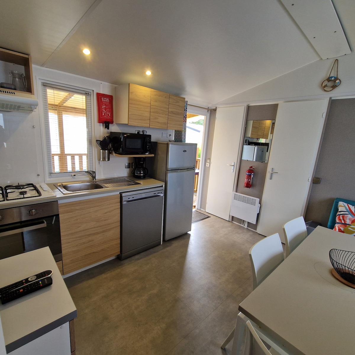 M-home 35 m2 chez Catou à Kerfany Plage en bord de mer Grande terrasse couverte, 2 chambres, cuisine équipée : gazinière, four et micro-ondes, hotte, cafetière, bouilloire, grille-pain, TV connectée internet wifi gratuit (Starlink 250Mb/s) dédié au logement Animaux propres et sympas bienvenus Petit camping familial au calme, à 100m de la plage et du sentier côtier, 50m de la forêt, à 3 km des commerces (supérette, tabac, pharmacie...) et à coté de Concarneau, Pont-Aven ou Lorient