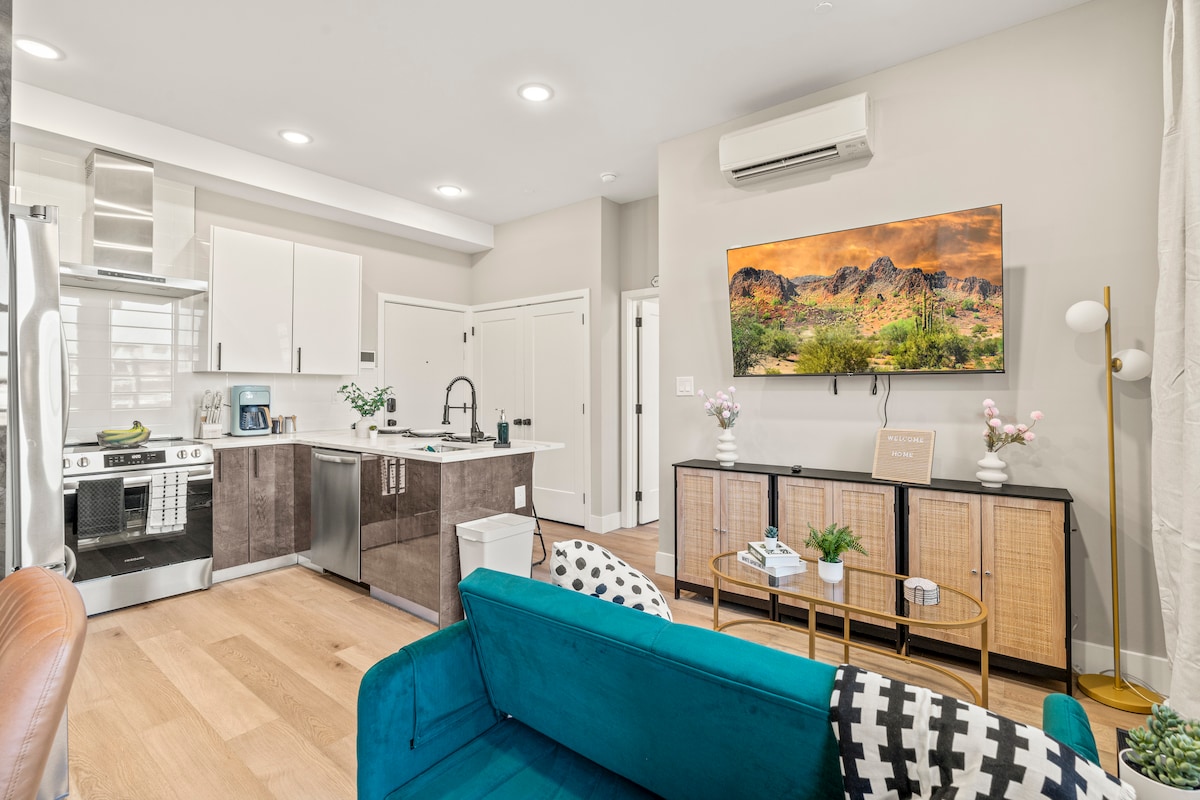 Bienvenido a The Explorer Suite, un estudio en el barrio de Fishtown en Filadelfia. Situada en la planta baja de un edificio de ladrillo renovado, The Explorer Suite cuenta con una entrada privada con un cuarto de barro para dejar caer tu abrigo y zapatos antes de entrar en el apartamento de concepto abierto que cuenta con una cama tamaño king, wifi, baño privado, gran área de armario, sala de estar con un sofá cama y TV inteligente, y una cocina completa equipada con té y café y utensilios de cocina.