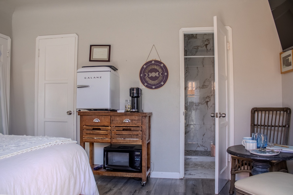 Un refugio sencillo y acogedor, como los antiguos cuartos de los viajeros Esta pequeña pero acogedora casa de huéspedes/estudio ofrece un guiño nostálgico a las estancias de viaje clásicas. Los huéspedes pueden relajarse en un espacio cuidadosamente diseñado con elementos básicos de cocina y comodidades, aire acondicionado y calefacción centrales, un baño de ¾ y un televisor inteligente con servicios de streaming. Perfecto para una parada tranquila o una escapada minimalista.