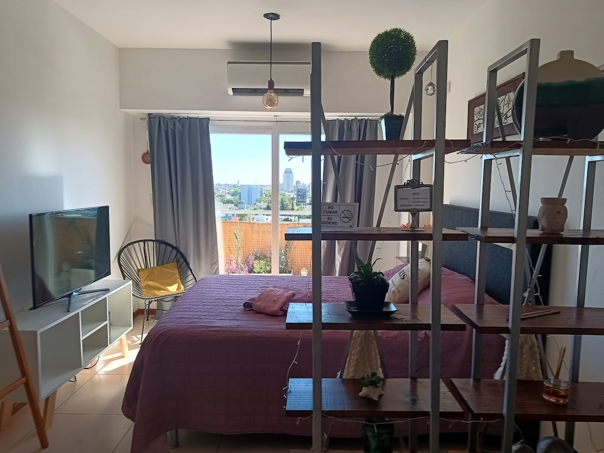 Relájate en este espacio tranquilo y elegante. Departamento de 34 m2, con comodidad para 1, 2 y 3 personas, con cama matrimonial (colchón y almohadas de excelente calidad) y un sillón-cama de 1 plaza. Está equipado con cortinas de blackout. aire acondicionado frío-calor, Wifi, Tv 40” con chromecast , una cocina amplia con heladera-freezer, microondas, cocina/horno, pava eléctrica, cafetera eléctrica, tostadora y vajilla completa, para que los huéspedes puedan cocinar.