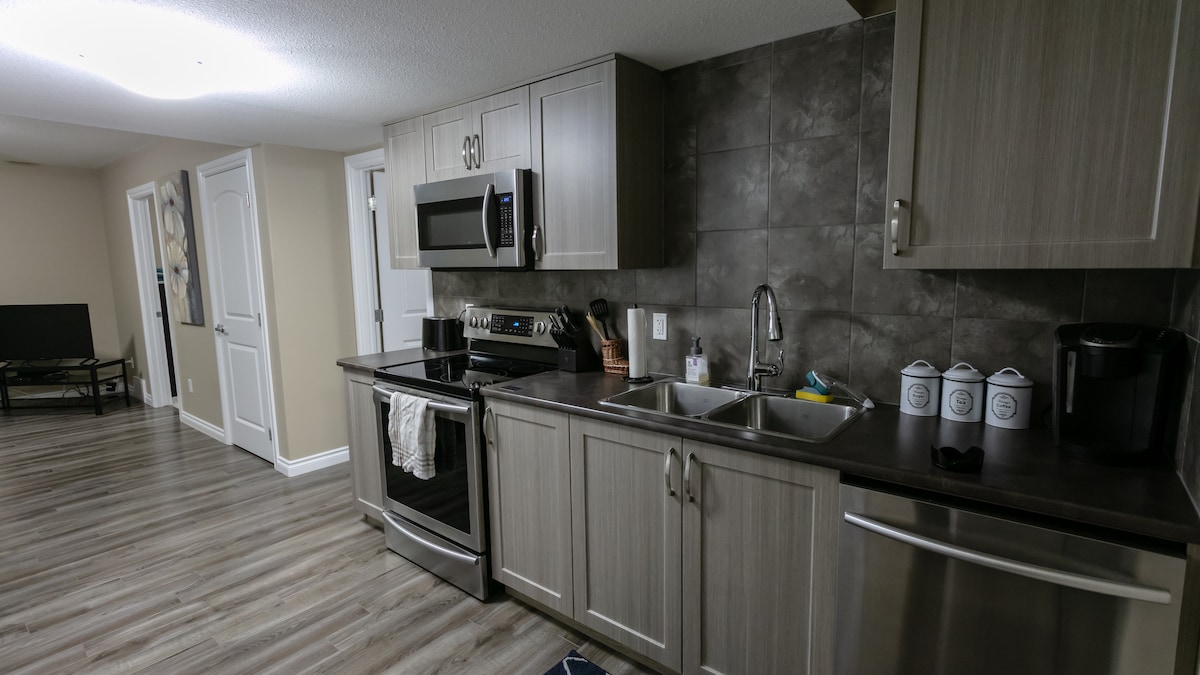 Bienvenido a esta suite de nuevo diseño. Esta suite es muy espaciosa y cuenta con sala de estar abierta, cocina, comedor y dormitorio principal. Situada en Timberlea, a 1 minuto a pie de paradas de autobús, a pocos minutos a pie de senderos para caminar y a poca distancia en coche de tiendas de comestibles. Unidad completamente separada de la planta superior sin puertas que conecten los espacios. Esta acogedora suite incluye cocina completa, TV de 55 y 65 pulgadas con Netflix, Disney+ y Prime, 1 cama tamaño king y 1 cama tamaño queen, vestidor, baño completo, lavandería e Internet.