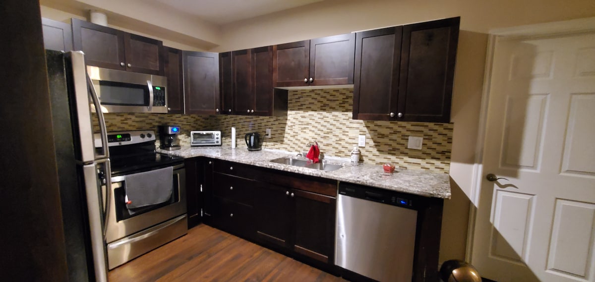 Suite de dos dormitorios en el sótano legal en Parsons Creek. Tiene su propia entrada independiente. Incluye cocina completa (fogones, horno, microondas, nevera/congelador, lavavajillas, cafetera keurig). La cocina está equipada con platos y cubiertos. Lavadora y secadora en la unidad. Caldera separada para controlar la temperatura. Suscripción a Netflix disponible. Lugar agradable y cómodo.