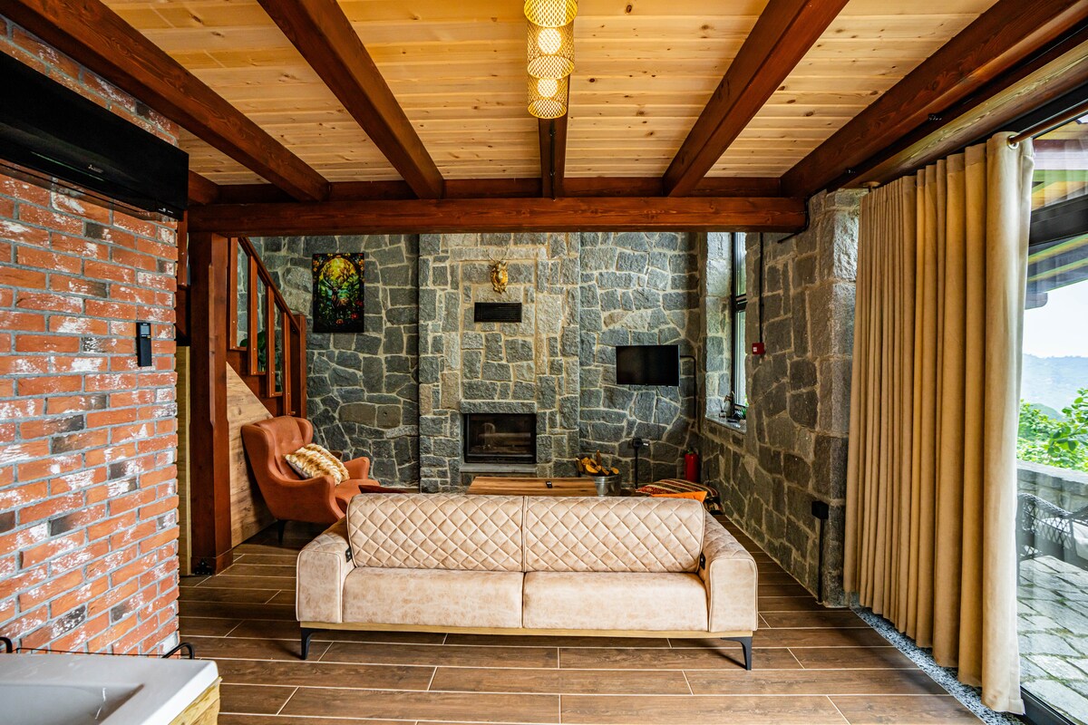 Ofrecemos una experiencia vacacional cómoda y tranquila en Stone Villas con jacuzzi de diseño privado ubicado en el corazón de la naturaleza en el bungalow Gafulluk. 92 m² con 1 sala de estar, 1 sala de estar, 1 baño Hardware de la cama; 1 doble. 1 individual 1 sofá cama Características destacadas; - Balcón. - Cocina pequeña. -Avlu - Jacuzzi. - Chimenea