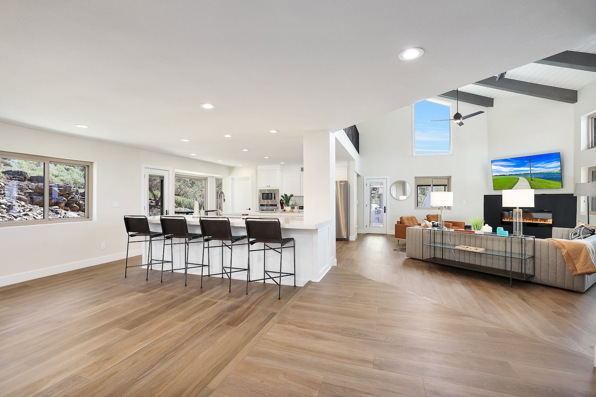 ¡Disfruta de una experiencia elegante en Black Mountain! ¡Joya moderna, de diseño y completamente renovada! Ofrece lujo, privacidad, serenidad y vistas panorámicas de 360 grados. ¡Luces de la ciudad, puesta de sol, amanecer, vistas a las montañas desde lo alto de Black Mountain! Vistas de un millón de dólares desde la terraza del segundo nivel que rodea la casa con acceso privado desde el dormitorio principal. ¡Una segunda terraza privada se encuentra junto a un dormitorio de invitados! ¡Enorme espacio al aire libre con chimenea y gran patio trasero con vistas a la cima de Black Mountain!