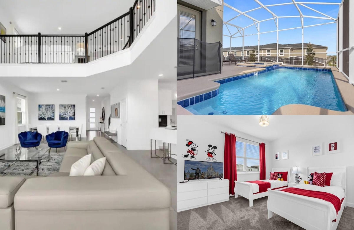 Los canadienses construimos esta lujosa casa de Florida. 6 dormitorios, capacidad para 12 personas, lanai con mosquitero, piscina de agua salada mejorada, piscina infantil, spa/bañera de hidromasaje (calefacción de la piscina/spa 35 USD/día). Piano. Televisores inteligentes 4K en todas las habitaciones con Netflix, Disney, Prime, etc. Cocina completa con capacidad para 6+2 personas, comedor con capacidad para 10 personas, segunda nevera en el garaje, suelos de madera y cerámica, garaje para 2 coches con apertura, enchufe de 50 amperios para cargar vehículos eléctricos. A minutos de Disney/Universal, Margaritaville. Cuna/corralito/trona. Escritorio de ordenador, silla. Internet ultrarrápido.