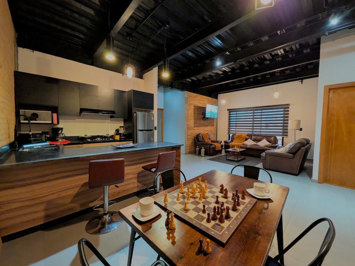 Disfruta tu estancia en Durango en un departamento industrial de lujo cómodo y tranquilo. Un estilo moderno e único en durango con acabados de lujo Cocina completamente equipada para preparar lo que necesites Sala con pantalla smart que tiene Netflix Dos cuartos uno con su propio baño Centro de lavado con lavadora y secadora en el departamento Cochera electrica para tu vehículo Y todo en una excelente ubicación muy central y facil de llegar a los puntos más interesantes de Durango