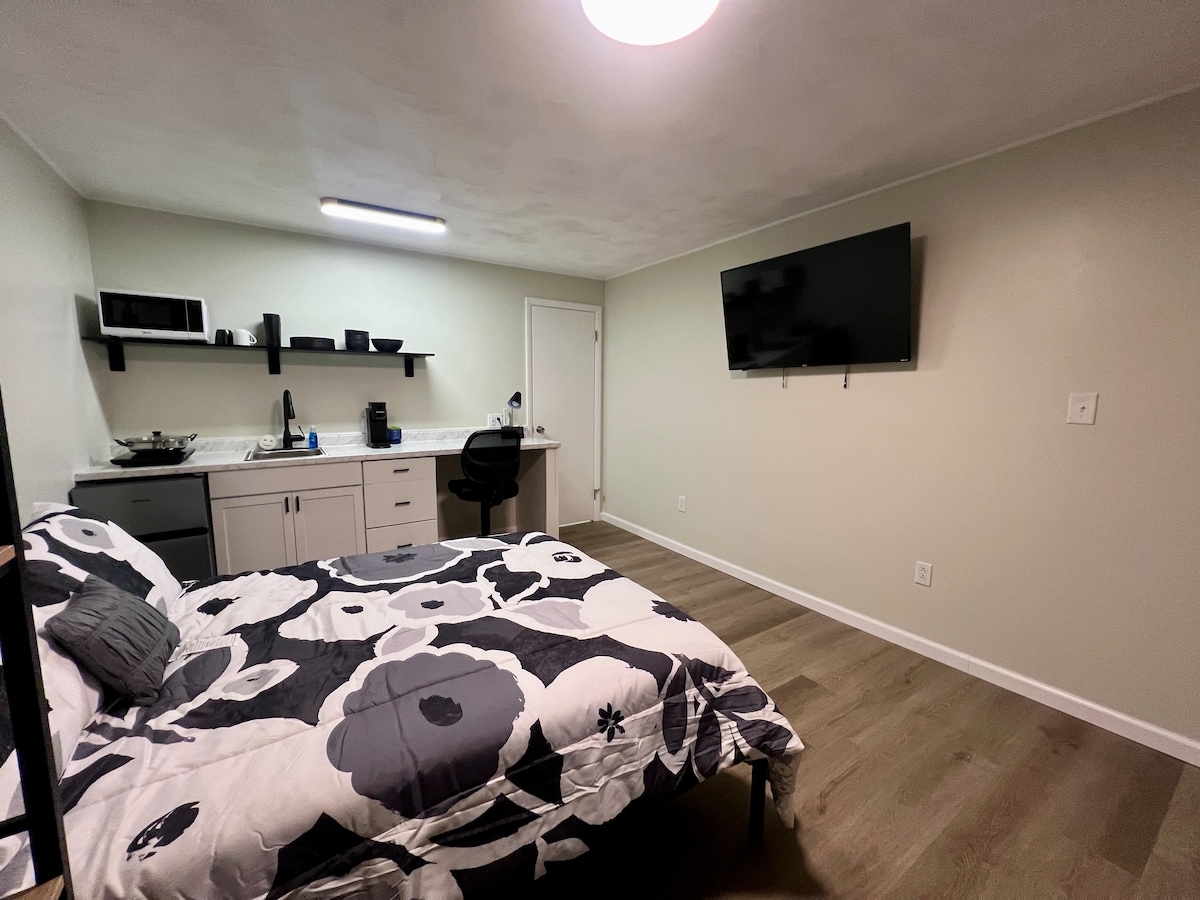 Un acogedor y cómodo dormitorio en un lado de un dúplex con todo lo necesario y nada que no lo sea. ¿Cama tamaño king? Sí. ¿Sofá cama? Sí. Cocina para comer cereales o gourmet (no juzgamos), rincón de oficina para “trabajar” y un baño fresco con un nuevo grifo e inodoro. Estacionamiento en garaje, entrada compartida, lavandería en el sótano. No es lujoso, pero es mucho más agradable de lo que cabría esperar. Perfecto para descansar, ducharse y recargar energías.