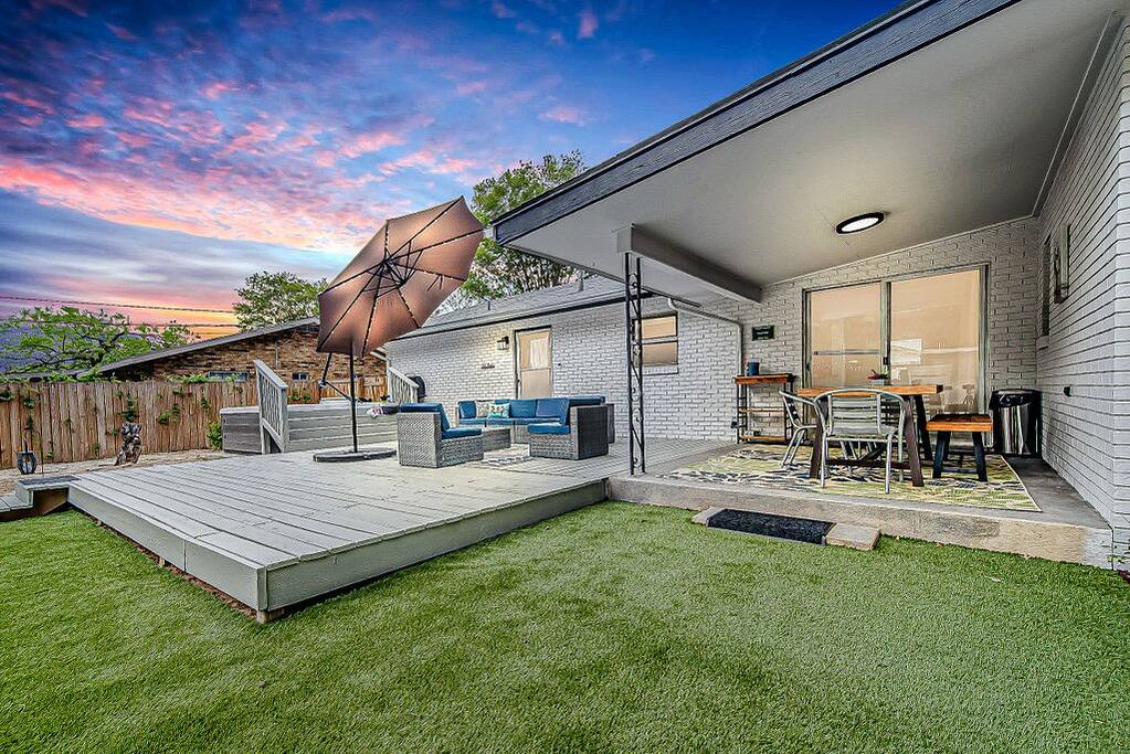 Gather with family and friends! Updated 3 king beds/2 baths/2 blocks off Main on corner lot. In the evening, enjoy the hot tub in fenced pet-friendly oversized yard, have wine by the fire pit as the deer emerge from banks of Town Creek, or enjoy a game of ping pong/corn hole. The home features soaring ceiling/open-concept design perfect for meals/games. Kitchen has new appliances and large sit around bar. Patio offers gas and charcoal grills. Make MEMORIES at Bowie-N-Travis! Permit #8056001607