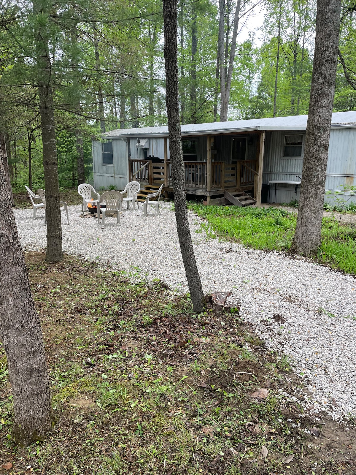 A pocos minutos del centro de French Lick, esta caravana es la manera perfecta de explorar la naturaleza con comodidad. Con comodidades de primera línea, esto hará que tu próximo viaje sea inolvidable. El interior cuenta con una amplia sala de estar con cómodos asientos y una cocina totalmente equipada, con nevera, estufa y microondas. El dormitorio tiene un lujoso colchón tamaño king, mientras que la sala de estar ofrece un sofá cama y una cama pequeña, suficiente espacio para 6 huéspedes en total.