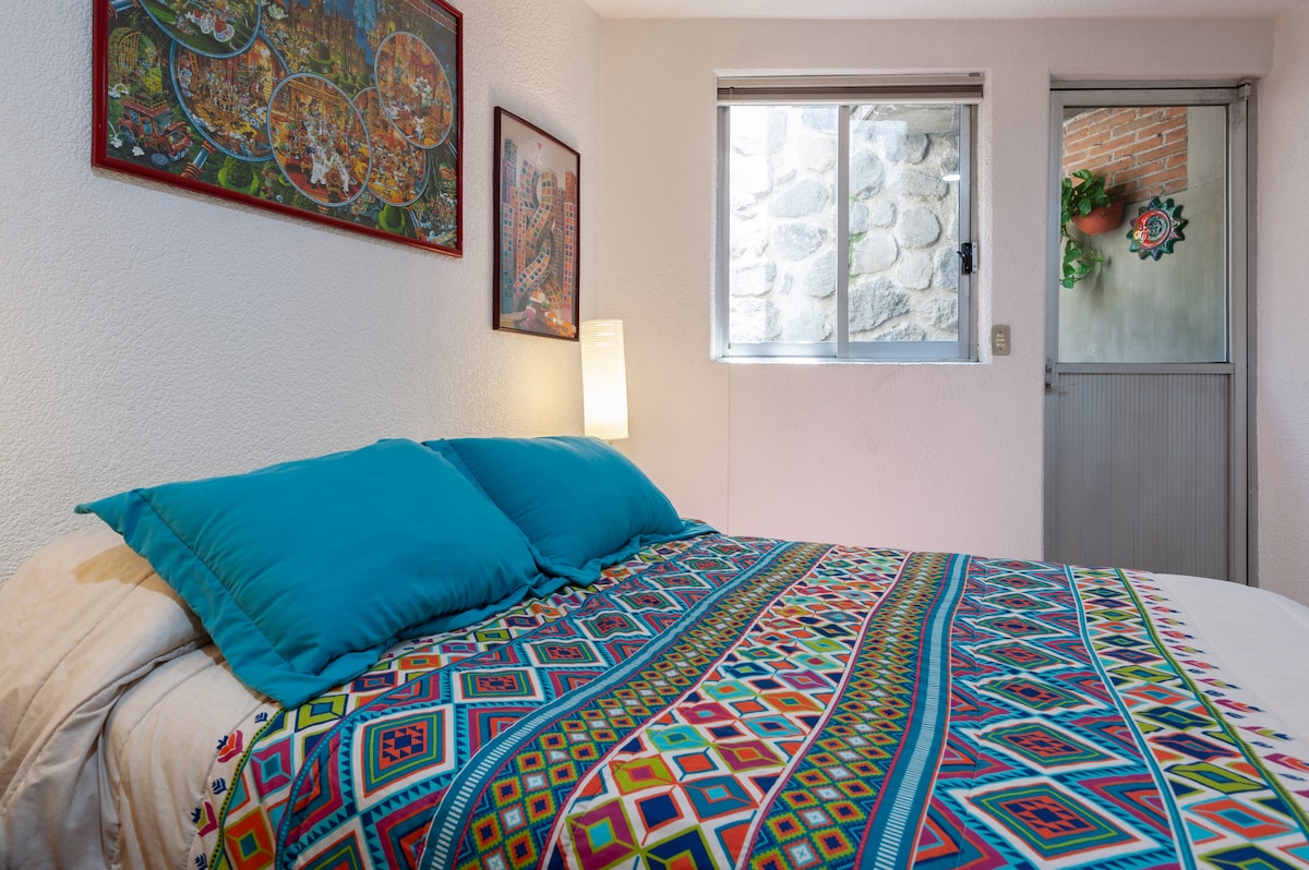 Cómodo bungaló en el corazón de Coyoacán, dentro de un complejo de casas con decoración colonial. Perfecta para la llegada de una familia pequeña o un grupo de amigos. Cuenta con cocina y baño privados. Habitación con los aditamentos necesarios para una cómoda estancia. Totalmente independiente y con lo esencial para una agradable estancia. Cuenta con áreas comunes y entrada individual.
