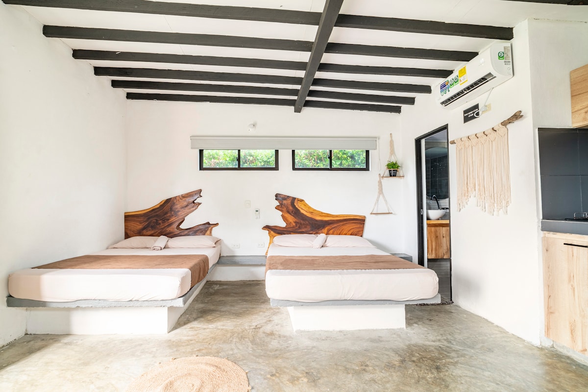 Despierta frente al Caribe colombiano, en una cabaña de madera rodeada de tranquilidad y naturaleza. Disfruta de nuestro Yoga-Bar, un espacio para meditar, leer o compartir una copa al atardecer. La cocina al aire libre está equipada con todo lo necesario para preparar tus comidas. Contamos con dos baños, uno interior y otro bajo el cielo abierto. Es el lugar ideal para parejas o viajeros que buscan reconectarse con la naturaleza y compartir con la comunidad que da vida al Caribe más auténtico.