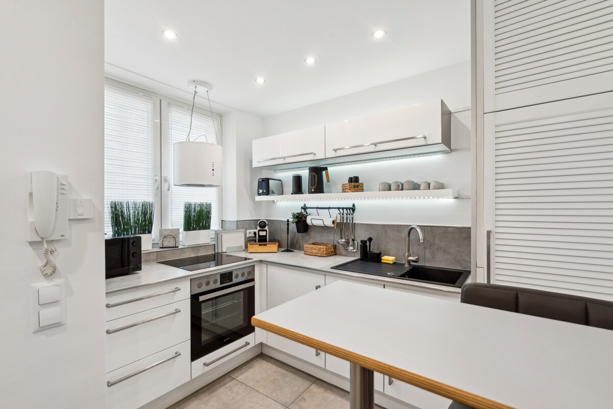 Apartamento ático dúplex de casi 45 metros cuadrados, con todo lo importante para un pequeño apartamento de la ciudad. Sala de estar con sofá, TV e internet. Cocina de menta con estufa, horno, lavavajillas, cafetera y nevera. Una escalera conduce a la zona superior del apartamento con baño y dormitorio. Pequeño baño de día con bañera. La pared de vidrio integrada permite una ducha sin complicaciones. Dormitorio con cama doble de 1,60. Armario con vestidor. Agradable piso de roble