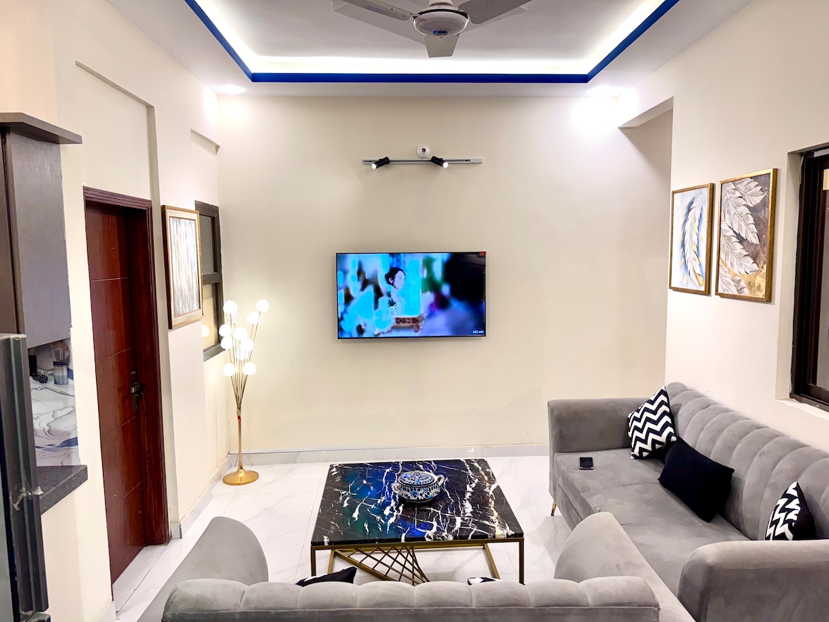 Apartamento familiar premium de 2 dormitorios Ubicación ✓ privilegiada cerca del aeropuerto y Jinnah Ave Food Street ✓ 2 dormitorios con baños adjuntos + amplia sala de estar Cocina ✓ totalmente equipada y suministros de limpieza proporcionados Electricidad ✓ 24/7 (generador de respaldo) y suministro de agua ✓ Estrictamente para familias: no se permiten fiestas ni música alta ✓ CNIC/pasaporte obligatorio para el check-in ✓ No se permite fumar ni consumir drogas Se ✓ puede conducir hasta Malir Cantt y Falcon Society Amueblados ✓ cuidadosamente para que tus estadías sean cómodas ¡Reserva tu escapada familiar segura y cómoda hoy mismo!