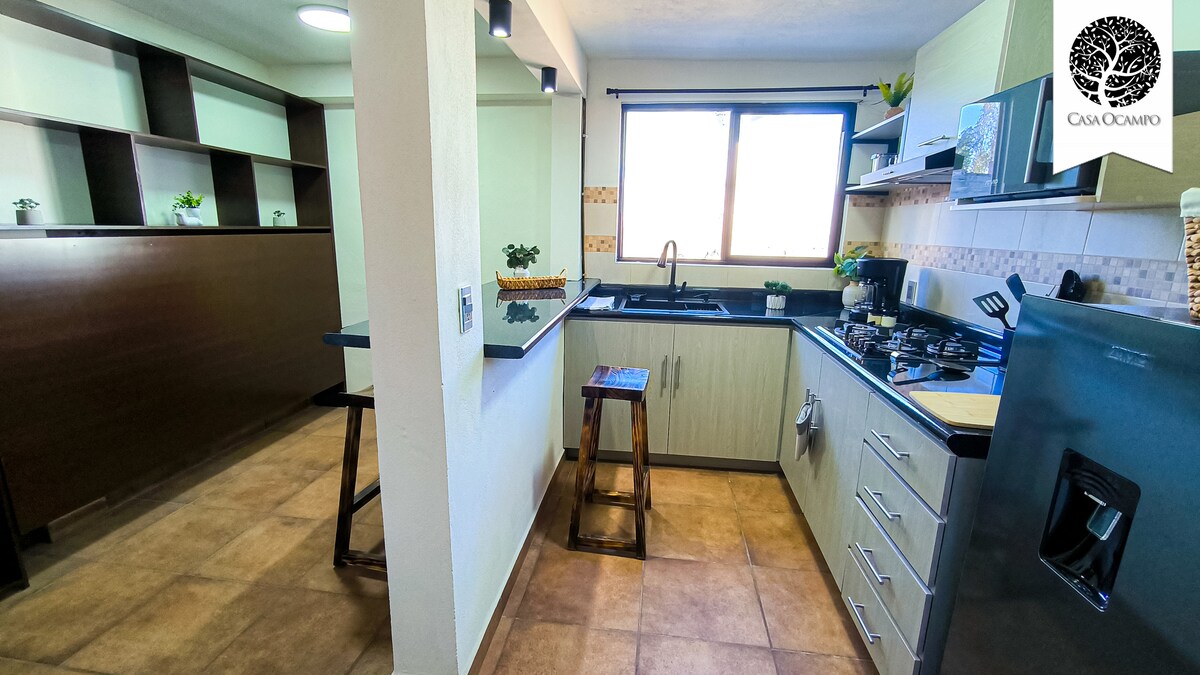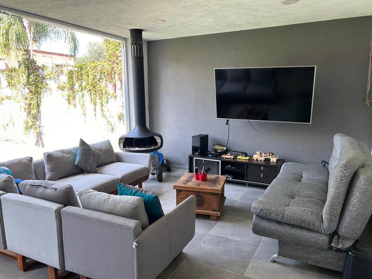 Relájate en este espacio tan tranquilo y elegante, lleno de vida con su hermoso jardín, su relajante jacuzzi, la espectacular televisión de 75 pulgadas en la sala, para ver tus películas y series favoritas. Además está muy bien ubicado para disfrutar de Tequisquiapan y sus alrededores plenamente, como sus queserías, viñedos, globo aerostático, cuatrimotos, caballos, restaurantes, bares y recorridos. No dejes de visitar la Peña de Bernal, las minas de ópalo, etc.