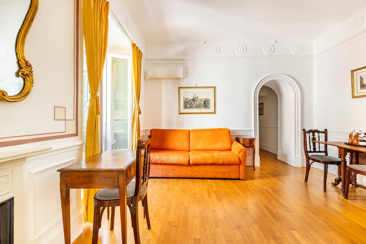 Nuestro lujoso apartamento se encuentra a un tiro de piedra de la famosa Plaza de España, la Fontana di Trevi y las tiendas más elegantes del mundo en Via Condotti. Admira la mezcla de lo antiguo y lo moderno: vigas originales del siglo XVIII y finos muebles antiguos junto con comodidades y muebles contemporáneos. Tómate un café en el sofá dorado y luego ve a descubrir Roma.