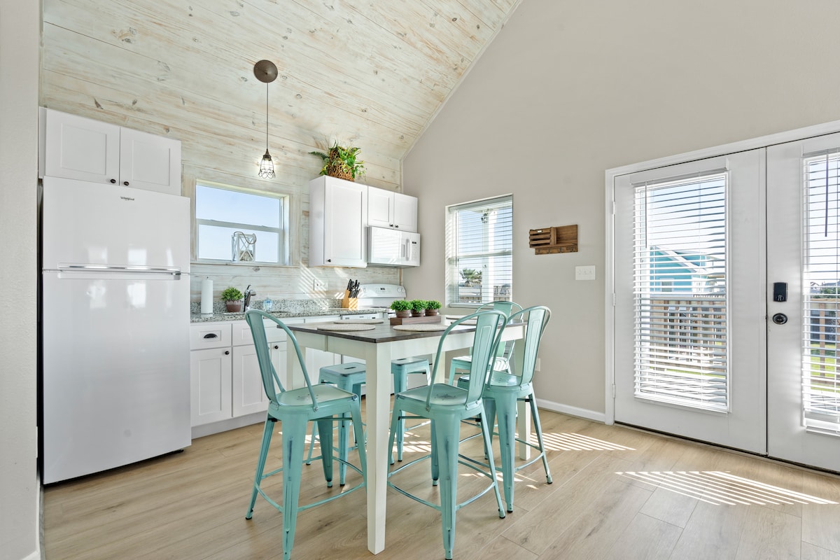 Experimenta la verdadera hospitalidad en mi casa de campo de estilo inglés junto al mar. El espacio se siente como una suite acogedora en un hotel de lujo. En el interior disfrutarás de un ambiente de casa de campo cómodo, cama tamaño king con sábanas de lujo, cocina pequeña totalmente equipada y comedor pintoresco, combinación de bañera y ducha en el baño. Disfruta de las cálidas brisas del golfo desde el patio privado. Nuestra especialidad es ofrecerte un espacio íntimo para que crees hermosos recuerdos. A minutos de la playa 🏖️ y de todo lo que Galveston tiene para ofrecer.