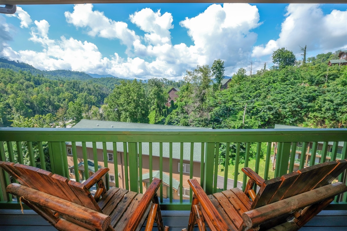 ¡Precioso condominio renovado en el centro de Gatlinburg! Cuenta con un cómodo dormitorio King size y sofá cama en la sala de estar. ¡Disfruta de tu balcón privado antes de dirigirte a la piscina en verano o da un paseo al centro de la ciudad para explorar todo lo que Gatlinburg tiene que ofrecer! ¡Hay 2 televisores, una chimenea, Internet de alta velocidad y una hermosa caseta de cocina! ¡El estacionamiento es gratuito en los condominios!