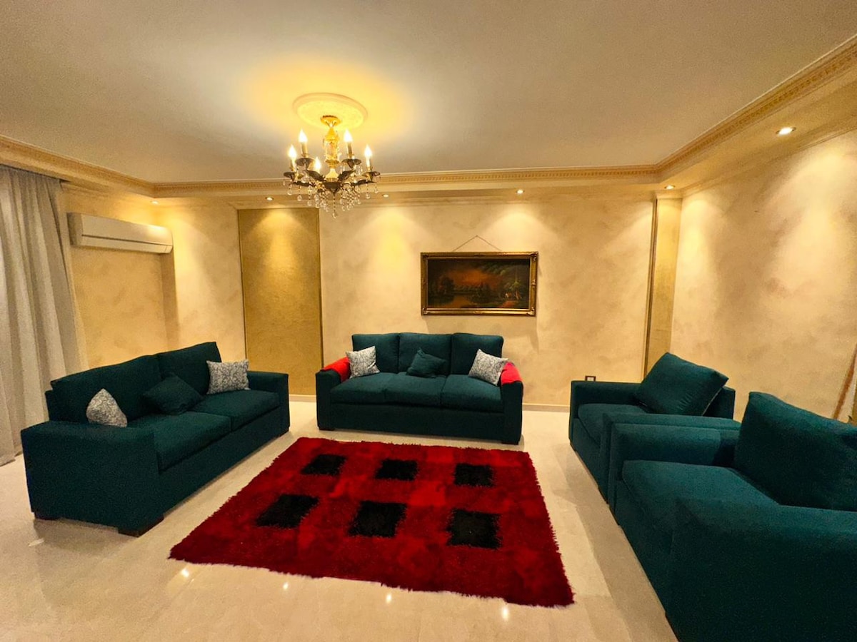 Apartamento de 3 dormitorios con un estilo precioso en el corazón de Nasr City, perfecto para familias y grupos. Disfruta de un amplio balcón, Wi-Fi rápido, cocina moderna y cómodo salón, a solo unos pasos de los mejores centros comerciales, restaurantes y todas las atracciones de la ciudad. 🏡 El espacio Ubicado en el cuarto piso de un edificio con ascensor, este apartamento recién amueblado es una verdadera mezcla de estilo y funcionalidad: 🛏 Dormitorios Dormitorio principal: cama tamaño king, baño privado, vestidor grande, aire acondicionado y sábanas suaves.