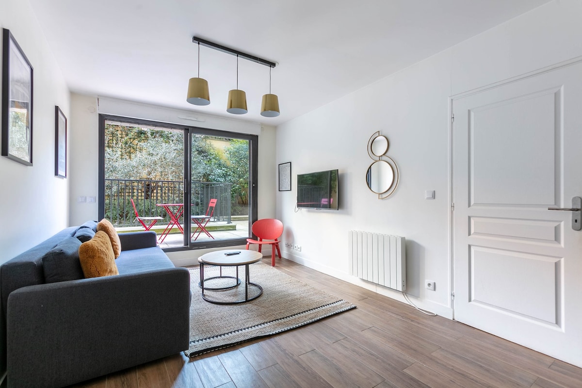 Este apartamento tranquilo y espacioso tiene una sala de estar con TV inteligente y zona de comedor, 2 dormitorios abiertos a una gran terraza con jardín y un baño con inodoro. El primer dormitorio tiene una cama king size de 180 cm x 200 cm, un armario de un escritorio.El otro dormitorio una cama de matrimonio de 160 x 200 cm, armario y escritorio. Este apartamento de 3 habitaciones se encuentra a 2 min a pie de París y del metro Kremlin-Bicêtre y a 20 min en metro del centro de París y del Museo del Louvres.