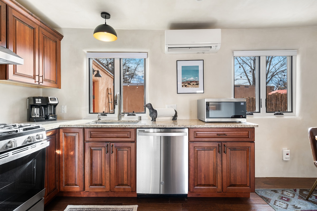 Disfruta de una estancia de primera clase en el corazón de la ciudad. Camina fácilmente a la plaza, museos, Canyon Rd. Hermosa casa de adobe restaurada de la década de 1930 con elementos esenciales de cocina completos, camas y ropa de cama de lujo y detalles elegantes en todas partes. Aire acondicionado, chimenea de gas, wifi de alta velocidad, (3) televisores con 185 canales y Netflix, cocina de gama alta, lavadora/secadora de tamaño completo. Precioso oasis PRIVADO en el patio trasero con fogata, barbacoa, fuente de agua, áreas de estar y comedor. Las claraboyas llenan el alojamiento de luz natural. ¡Experimenta la verdadera Santa Fe!